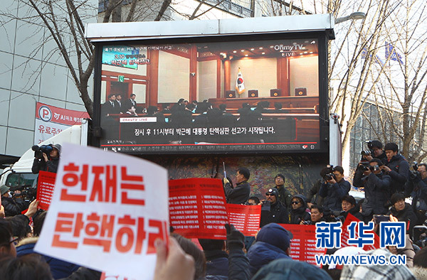 2017年3月10日,在韩国首尔宪法法院附近,反对朴槿惠的民众高举要求其下台的标语。韩国宪法法院当日宣布赞成弹劾总统朴槿惠,朴槿惠成为韩国历史上第一个被弹劾罢免的总统。新华社记者 姚琪琳 摄