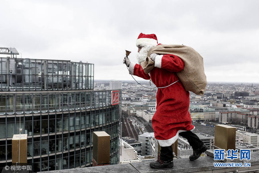 12月17日,德国柏林,一名男子装扮成圣诞老人从克尔霍夫塔上滑下,向小朋友们分发糖果。(图片来源:视觉中国)