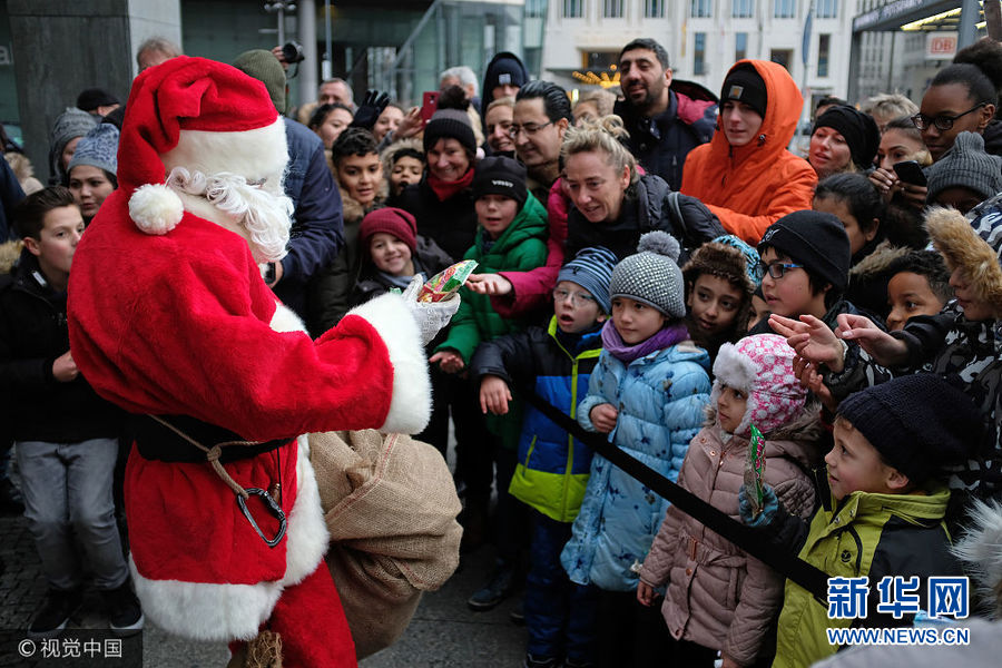 德国“圣诞老人”为小朋友发糖果 从天而降秀技能