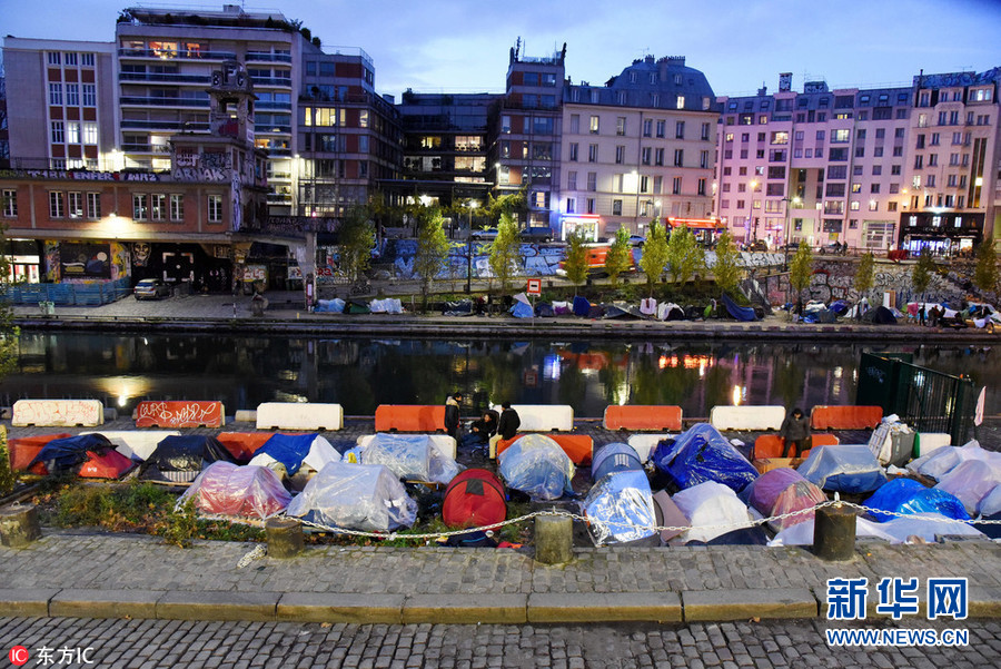 12月18日,法国巴黎,圣马丁运河两岸满是难民搭建的帐篷。中东与非洲局势的动荡使得大量难民涌入欧洲。法国就是众多难民远渡重洋后选择的目的地。据联合国难民署报道,截止2016年底,欧洲共有656万难民、寻求庇护人员和无家可归者。圣马丁运河(Canal Saint-Martin)是巴黎的一条运河,长4.5公里,连接乌尔克运河(Canal de l'Ourcq)与塞纳河。圣马丁运河被誉为巴黎“后花园”,一度是巴黎人在繁华喧嚣的浪漫之都寻找片刻安宁的休憩之地。(图片来源:东方IC)