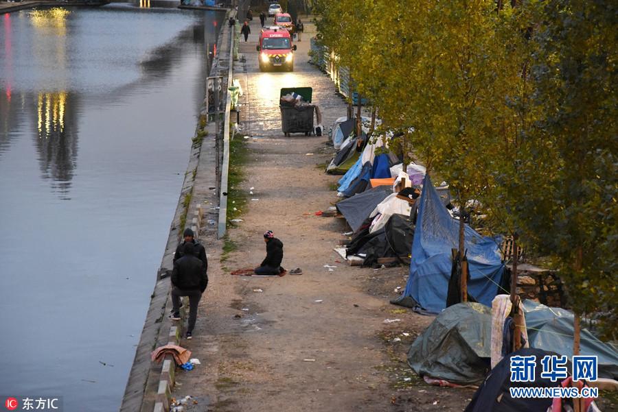 12月18日,法国巴黎,圣马丁运河两岸满是难民搭建的帐篷。中东与非洲局势的动荡使得大量难民涌入欧洲。法国就是众多难民远渡重洋后选择的目的地。据联合国难民署报道,截止2016年底,欧洲共有656万难民、寻求庇护人员和无家可归者。圣马丁运河(Canal Saint-Martin)是巴黎的一条运河,长4.5公里,连接乌尔克运河(Canal de l'Ourcq)与塞纳河。圣马丁运河被誉为巴黎“后花园”,一度是巴黎人在繁华喧嚣的浪漫之都寻找片刻安宁的休憩之地。(图片来源:东方IC)