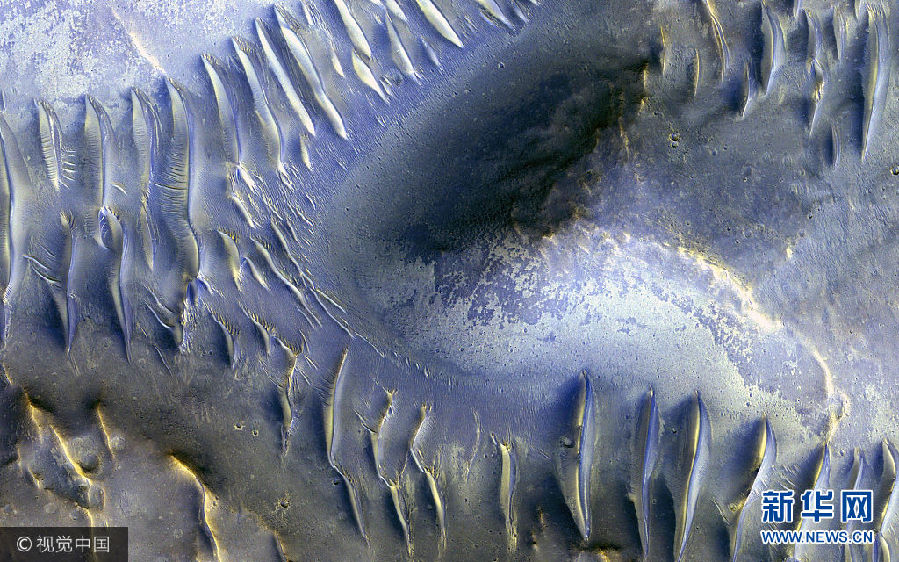 3月29日讯,火星勘测轨道飞行器拍摄到的图像显示,火星表面一个高地挡住从北向南延伸的沙丘。 (图片来源:视觉中国)