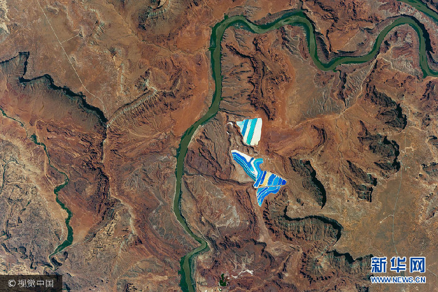 8月9日讯,宇航员从国际空间站拍摄到的美国犹他州摩押的氯化钾太阳能蒸发池。池中每一种颜色代表不同的蒸发状态。(图片来源:视觉中国)