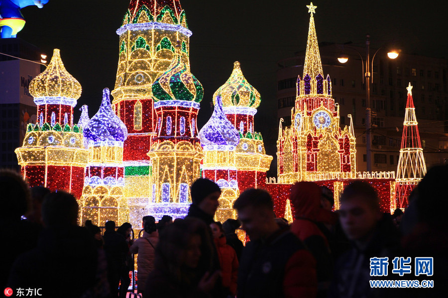 12月7日,俄罗斯莫斯科,圣诞灯打造的救世主塔和圣巴索大教堂,美轮美奂。