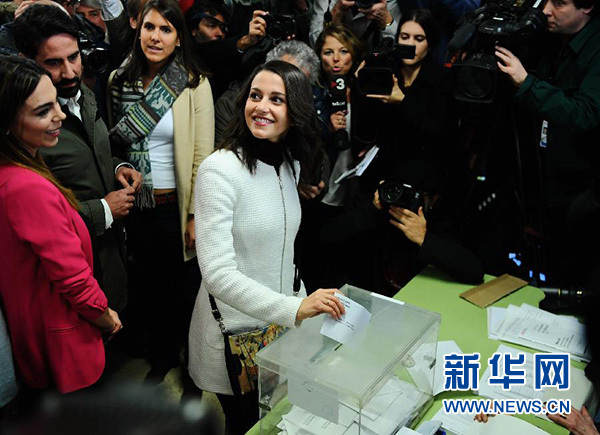 12月21日,在西班牙巴塞罗那,公民党候选人伊内斯·阿里马达斯(中)在一处投票站投票。新华社记者郭求达摄