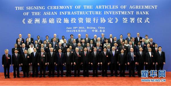 【正式成立】2015年12月25日,历经800余天筹备,由中国倡议成立、57国共同筹建的亚洲基础设施投资银行(亚投行)于当日正式成立,全球迎来首个由中国倡议设立的多边金融机构。图为2015年6月29日,国家主席习近平在北京人民大会堂会见出席《亚洲基础设施投资银行协定》签署仪式的各国代表团团长。