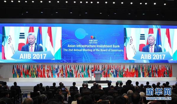 【第三次“吸粉”】2017年6月16日,亚投行宣布其理事会已批准3个新意向成员加入,分别为阿根廷、马达加斯加和汤加。至此,亚投行成员总数扩至80个。图为2017年6月16日,韩国济州,亚投行第二届年会开幕式现场。