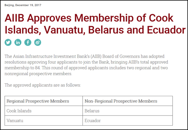 【第四次“扩容”】2017年12月19日,亚投行宣布批准库克群岛、瓦努阿图、白俄罗斯和厄瓜多尔四个成员的加入申请,成员增至84个,这是亚投行自开业以来的第四次“扩容”。图为亚投行官网截图。(新华网国际频道 徐海知)