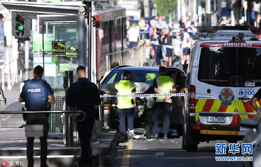 当地时间21日,澳大利亚墨尔本,据澳大利亚《时代报》报道,墨尔本街头发生一起汽车冲撞行人事件。一辆白色的SUV冲进人群,造成至少19人受伤。(图片来源:东方IC)