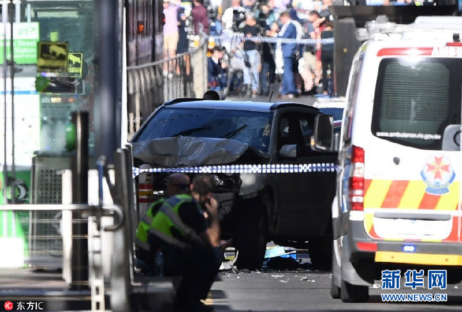 当地时间21日,澳大利亚墨尔本,据澳大利亚《时代报》报道,墨尔本街头发生一起汽车冲撞行人事件。一辆白色的SUV冲进人群,造成至少19人受伤。(图片来源:东方IC)