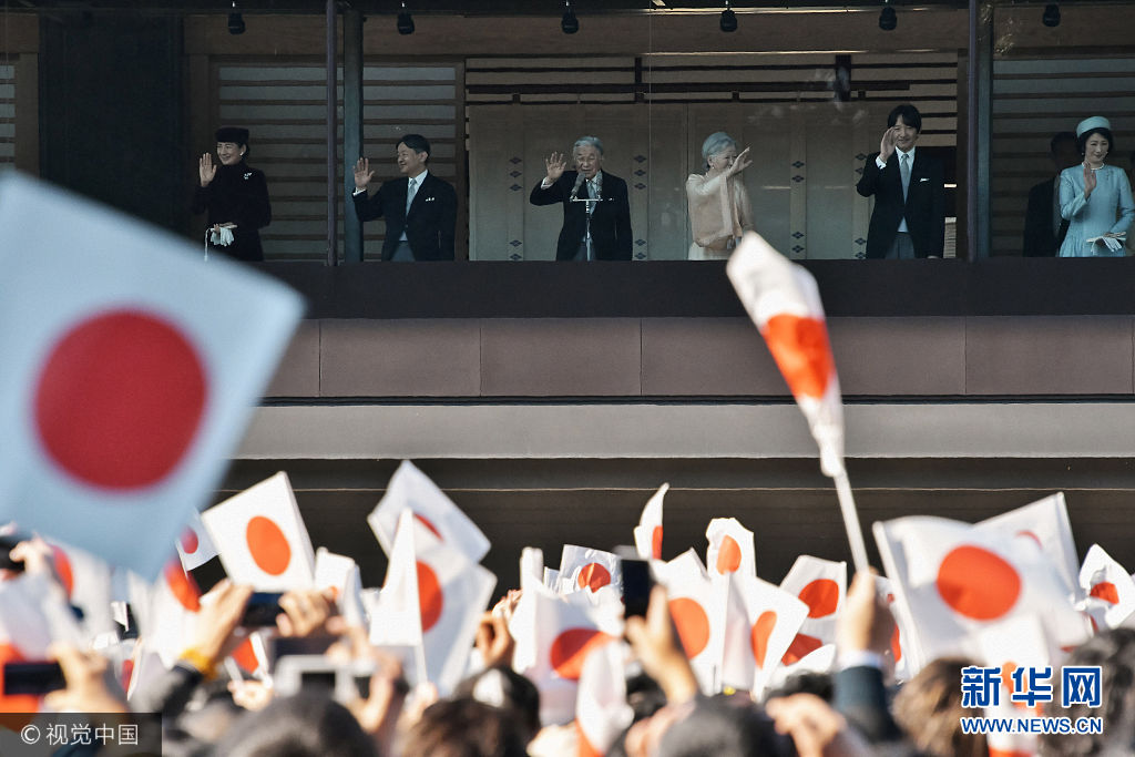 当地时间2017年12月23日,日本东京,日本明仁天皇庆祝84岁生日,在皇宫的阳台上向祝福者挥手致意。(图片来源:视觉中国)