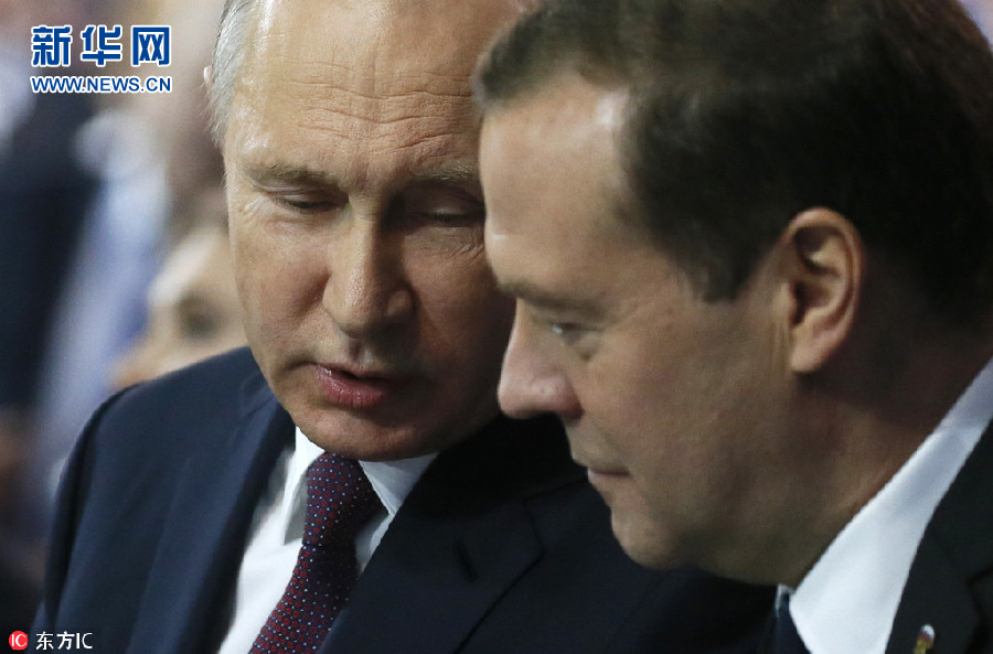 12月23日,俄罗斯莫斯科,俄罗斯执政党“统一俄罗斯党”年度会议举行,俄罗斯总统普京和总理梅德韦杰夫出席会议。据悉,梅德韦杰夫表示,俄罗斯执政党将全力支持普京,希望普京在2018年3月的总统选举中大获全胜。(图片来源:东方IC)