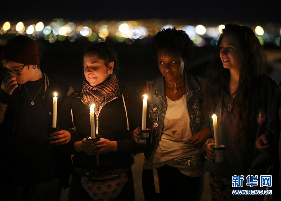 10月2日,在美国西部城市拉斯维加斯,人们参加烛光守夜活动,悼念枪击事件遇难者。10月1日晚,一名男子持枪从拉斯维加斯的曼德勒海湾酒店32层房间向楼下参加露天乡村音乐节的人群扫射,制造了美国现代史上死伤人数最多的枪击案。警方确认事件造成59人丧生、527人受伤。新华社记者王迎摄