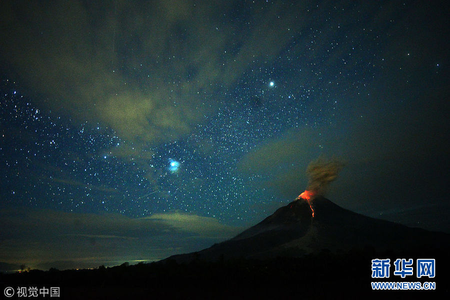 印尼锡纳朋火山再度爆发 夜空中岩浆顺流而下