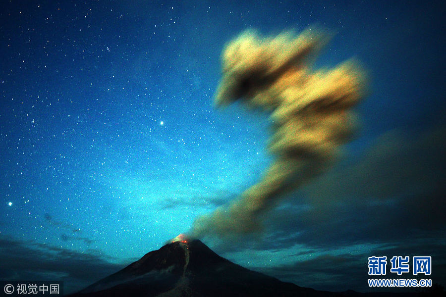 印尼锡纳朋火山再度爆发 夜空中岩浆顺流而下