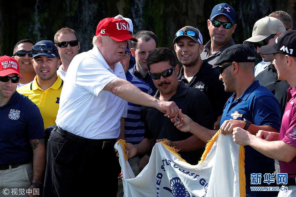 当地时间2017年12月29日,美国佛罗里达州西棕榈滩,美国总统特朗普邀请海岸警卫队队员打高尔夫球感谢他们的付出。