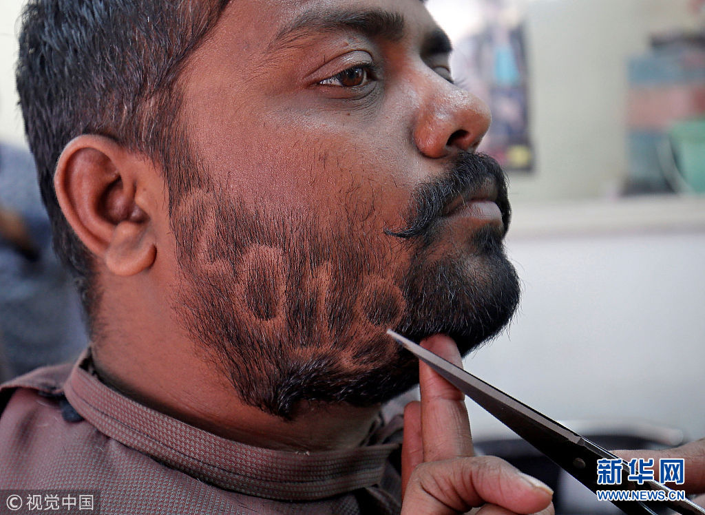 当地时间2017年12月29日,印度艾哈迈达巴德,一名男子在理发店内将自己的胡须修剪成2018的字样,迎接新年的到来。(图片来源:视觉中国)