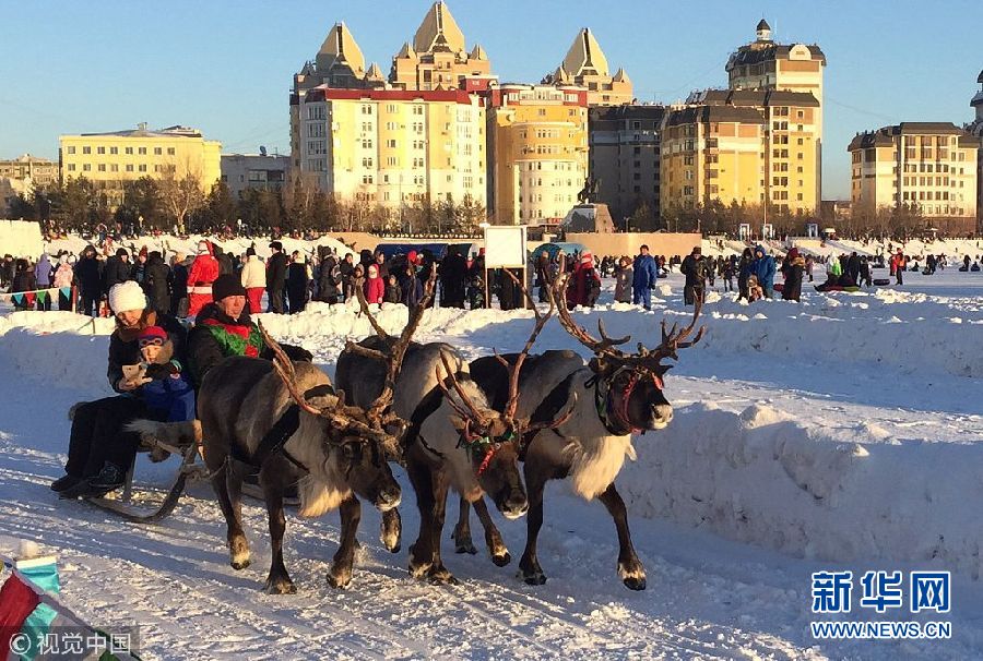 当地时间2018年1月1日,哈萨克斯坦首都阿斯塔纳民众在伊希姆河上享受冰雪乐趣,庆祝新年。图为民众乘坐驯鹿雪橇。(图片来源:视觉中国)