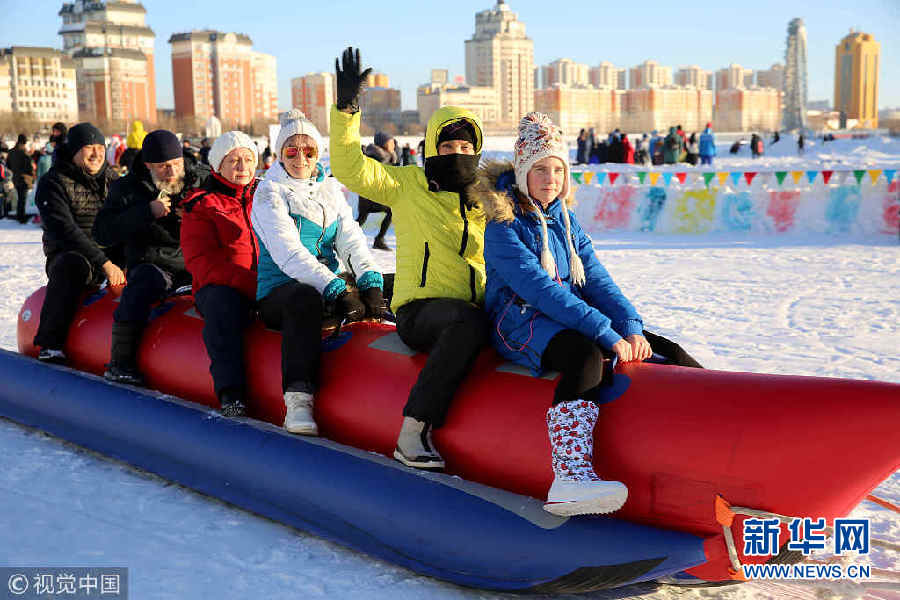 当地时间2018年1月1日,哈萨克斯坦首都阿斯塔纳民众在伊希姆河上享受冰雪乐趣,庆祝新年。(图片来源:视觉中国)