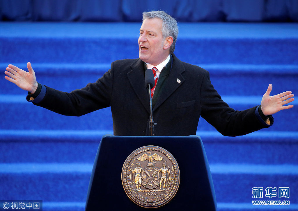 当地时间2018年1月1日,美国纽约,纽约市长白思豪宣誓就职,开始新任期。(图片来源:视觉中国)