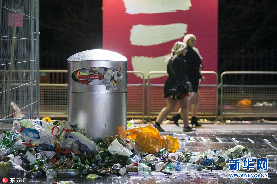 英国:狂欢过后遍地垃圾 清洁工作者清理跨年夜残局
