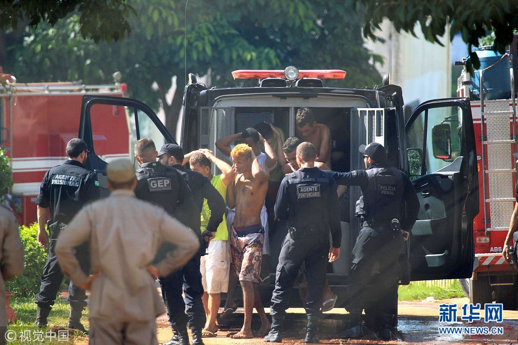 当地时间1月1日,巴西中部戈亚斯州都会区一所监狱发生暴动,造成至少9人死亡,14人受伤。据报道,这起暴动的起因是狱中两个敌对派别的犯人相互争吵继而斗殴,一些人还在狱中纵火,点燃被褥等物品。106名犯人趁乱越狱,目前已有29人被抓回。图为警卫将囚犯押送回监狱。 (图片来源:视觉中国)