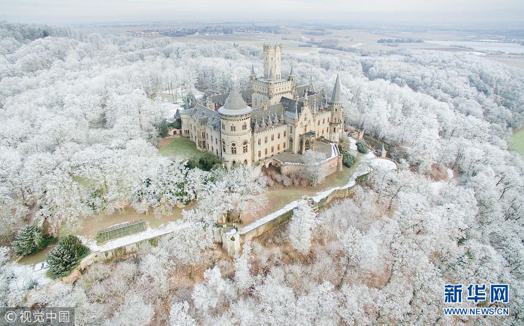 当地时间2017年1月18日,德国Pattensen,航拍雪地中的城堡。(图片来源:视觉中国)