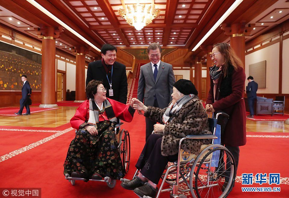 当地时间2018年1月4日,韩国首尔,韩国总统文在寅邀请“慰安妇”受害老奶奶们到青瓦台共进午餐。据报道,这是文在寅政府首次单独邀请“慰安妇”受害老奶奶到青瓦台。特朗普去年11月访韩时,李荣洙老奶奶曾受邀参加国宴。(图片来源:视觉中国)