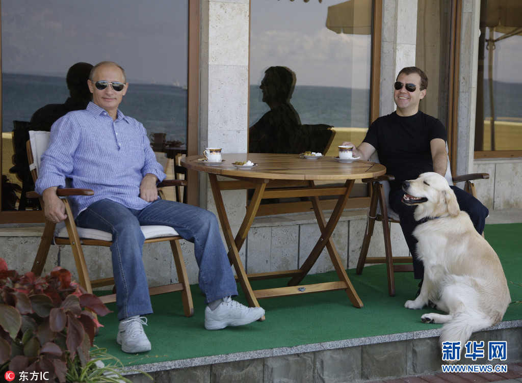 当地时间2009年8月14日,俄罗斯索契,俄罗斯总统梅德韦杰夫与总理普京带着狗在总统别墅外喝茶。