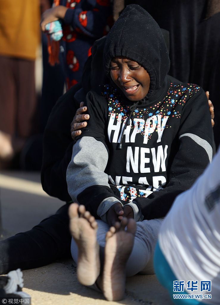 当地时间2018年1月7日,利比亚的黎波里,获救的非法移民。6日上午在利比亚附近海域发生了一起非法移民船倾覆事故,在巡逻飞机发现该遇险船只后,周围的意大利海岸警卫队及意大利海军船只迅速驶近实施救援,成功救起80余人,同时发现了8名遇难者。据外媒报道,这艘小船从该国海岸出发时载有超过100人。(图片来源:视觉中国)