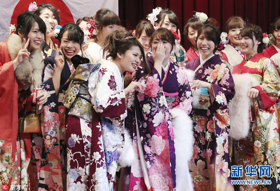 1月7日,日本福冈县北九州市,日本多地举办“成人节”庆祝仪式,少女们身穿和服盛装出席。(图片来源:东方IC)