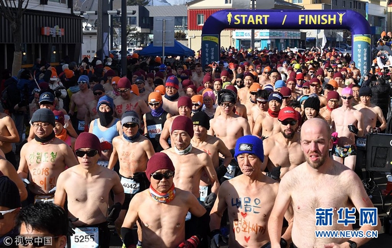 韩国平昌举办光膀子马拉松 参赛者严寒中赤膊上阵(图)