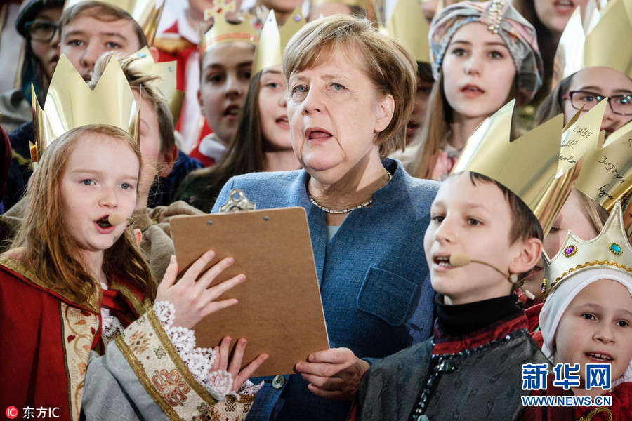 1月8日,德国柏林,德国总理默克尔接待来自全德各地的唱诗班,与孩子们一起吟唱。(图片来源:东方IC)