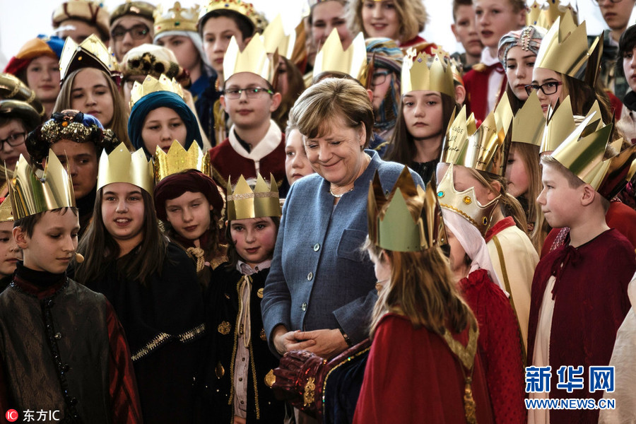 1月8日,德国柏林,德国总理默克尔接待来自全德各地的唱诗班,与孩子们一起吟唱。(图片来源:东方IC)