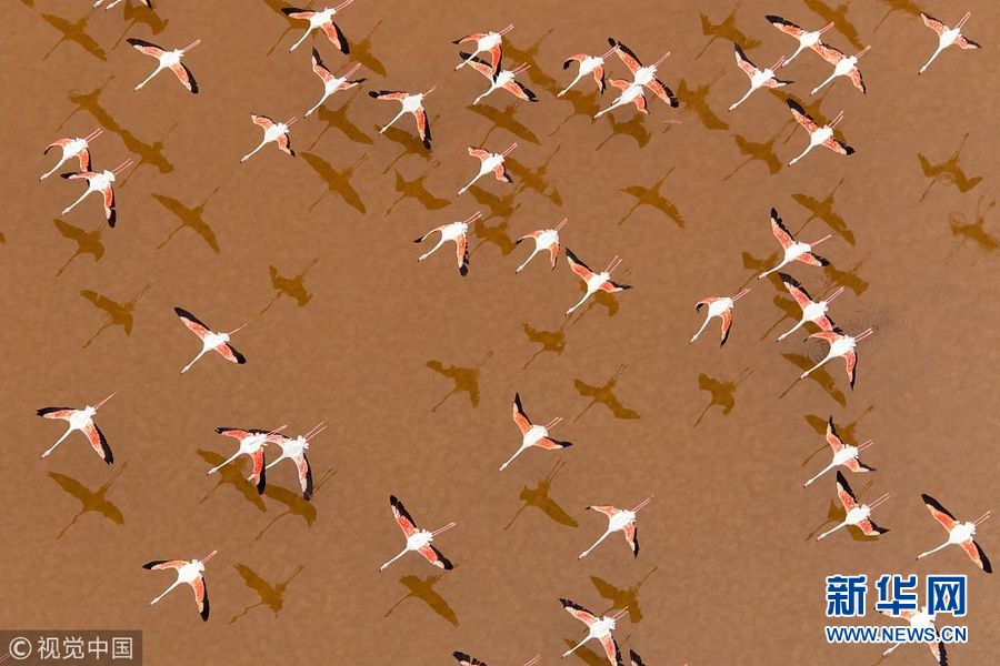 1月9日讯(具体拍摄时间不详), 西班牙卡迪兹海湾,数百只粉红色的火烈鸟飞过五颜六色的盐沼,在水面上形成令人惊叹的倒影。太阳落山时分,摄影师Oscar Diez在300米高空的飞机上拍下这些令人震撼的照片。(图片来源:视觉中国)