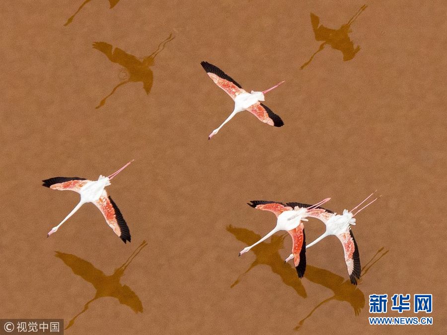 1月9日讯(具体拍摄时间不详), 西班牙卡迪兹海湾,数百只粉红色的火烈鸟飞过五颜六色的盐沼,在水面上形成令人惊叹的倒影。太阳落山时分,摄影师Oscar Diez在300米高空的飞机上拍下这些令人震撼的照片。(图片来源:视觉中国)