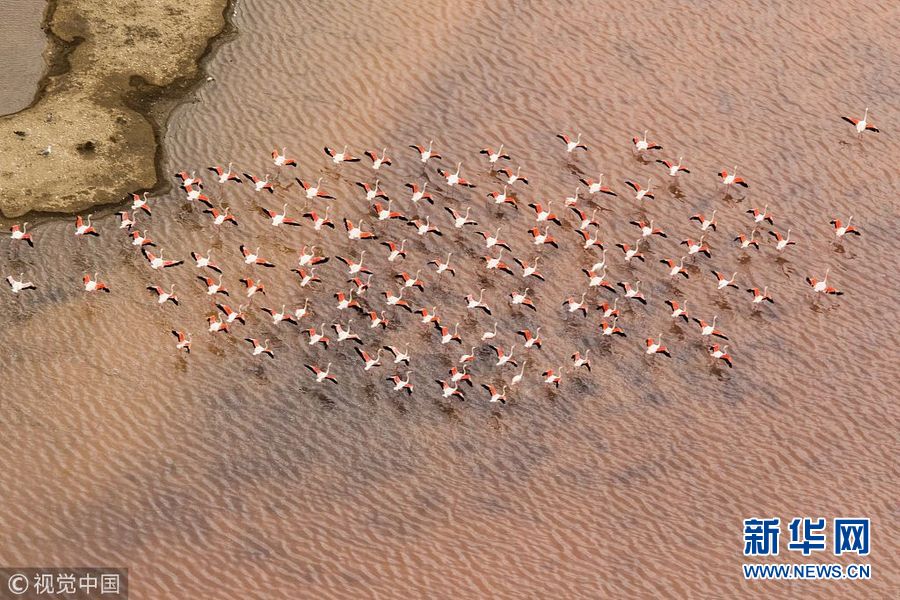 1月9日讯(具体拍摄时间不详), 西班牙卡迪兹海湾,数百只粉红色的火烈鸟飞过五颜六色的盐沼,在水面上形成令人惊叹的倒影。太阳落山时分,摄影师Oscar Diez在300米高空的飞机上拍下这些令人震撼的照片。(图片来源:视觉中国)
