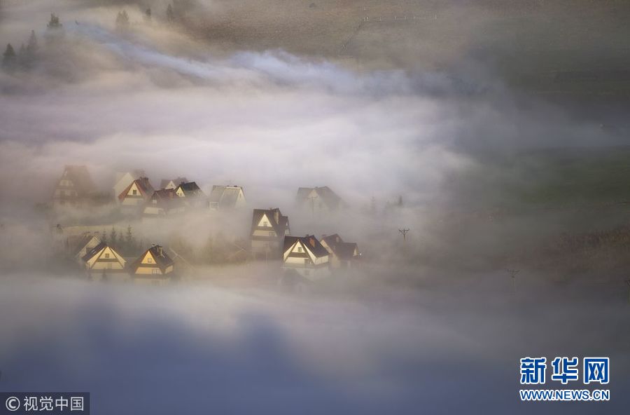 1月10日讯(具体拍摄时间不详),波兰皮耶尼内山脉的一个村庄被浓雾笼罩,摄影师站在对面山上拍摄的景观如童话世界一般,色彩缤纷的房子在浓雾中若隐若现仿若仙境。(图片来源:视觉中国)