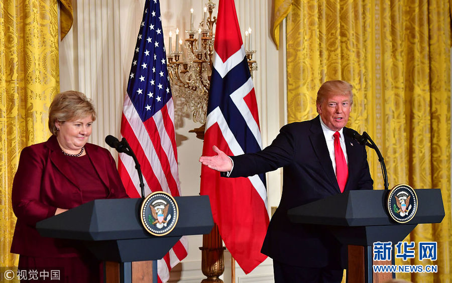 1月10日,美国华盛顿,美国总统特朗普会见挪威首相埃尔娜·索尔贝格。(图片来源:视觉中国)