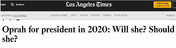 《华盛顿邮报》博主Jennifer Rubin也对奥普拉赞不绝口:“我们可以有一位表达清晰、受教良好、和蔼可亲、脚踏实地,同时又尊重我们民主机制的总统了。”
