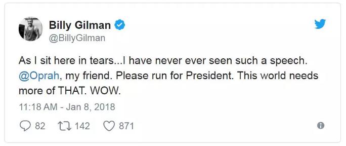 Billy Gilman: 我现在坐在这儿泪流满面……我从来没听过这样的演讲,奥普拉,我的朋友,请竞选总统吧,这个世界需要更多这样的声音。