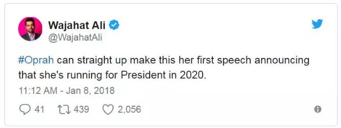 Wajahat Ali: 奥普拉可以直接把这次演讲当做宣布参选2020年总统竞选的演讲。
