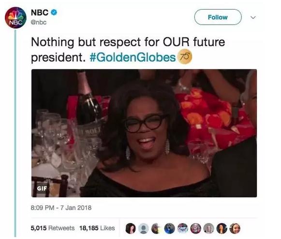 不过这则推文引发了大量争议,NBC之后将其删除,并解释称“只是借用颁奖礼现场的玩笑,并非政治声明”,但还是不难看出媒体及民众对奥普拉的诸多期待。