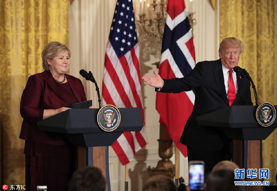 当地时间2018年1月10日,美国华盛顿,美国总统特朗普在白宫会晤来访的挪威女首相埃尔娜-索尔贝格,并举行联合新闻发布会。
