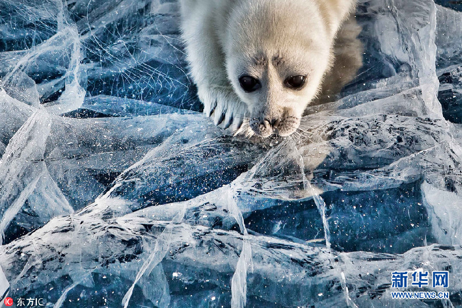 2018年1月11日报道,俄罗斯奥尔洪岛,摄影师Sergey Anisimov在当地的贝加尔湖拍摄到一只可爱的海豹宝宝。画面中小海豹正在冰面上穿行。(图片来源:视觉中国)