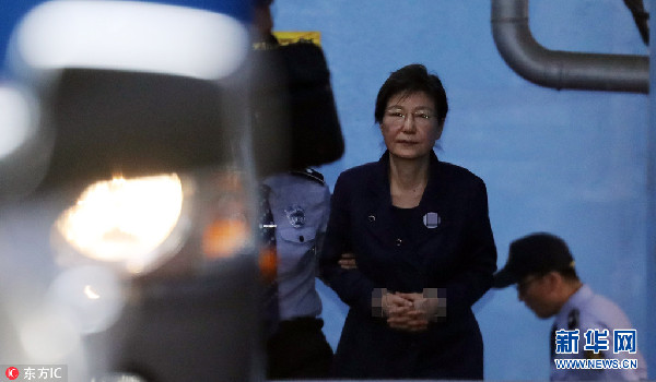 当地时间2017年10月16日,韩国首尔,韩国前总统朴槿惠在公审后戴着眼镜离开法庭。