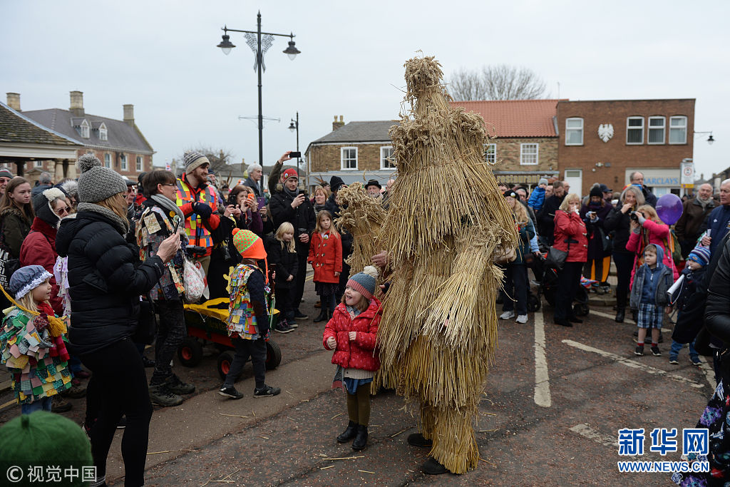 英国小镇庆祝“稻草熊”节 民众跟随草人尽情舞动