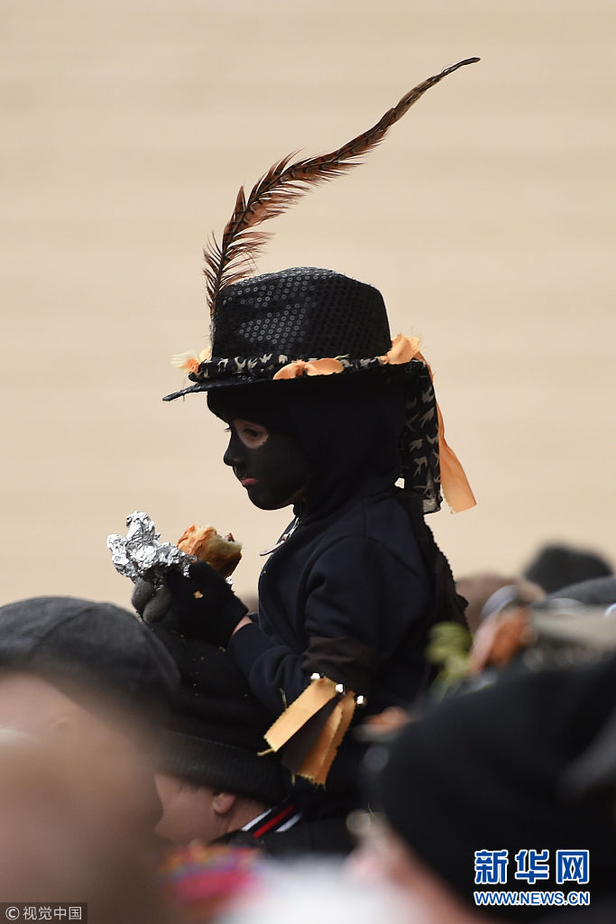 英国小镇庆祝“稻草熊”节 民众跟随草人尽情舞动