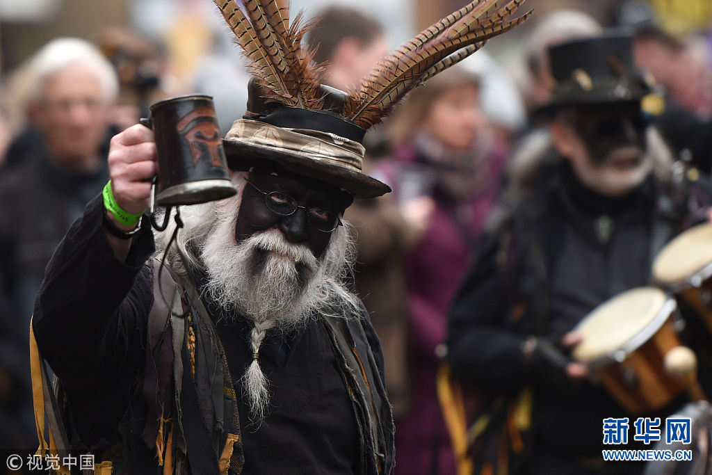 英国小镇庆祝“稻草熊”节 民众跟随草人尽情舞动