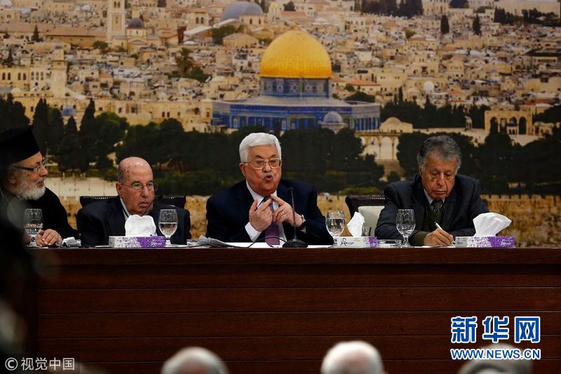 1月14日,约旦河西岸拉马拉,巴勒斯坦总统阿巴斯在巴勒斯坦中央委员会会议上发表讲话,并称以色列已经“终止”了奥斯陆协议。(图片来源:视觉中国)